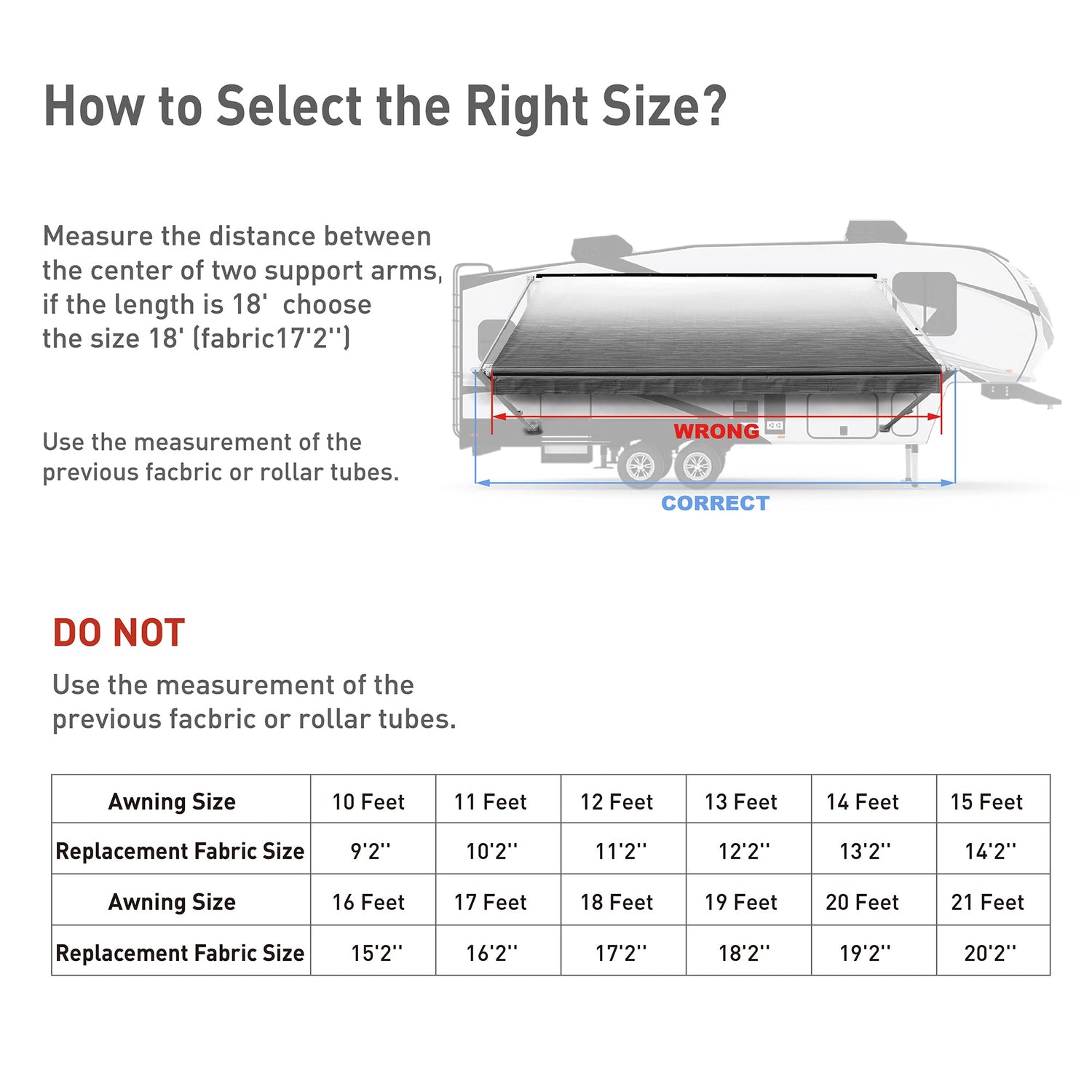 1. If there is an old awning on your RV, please measure the awning size from left arm center to right arm center.