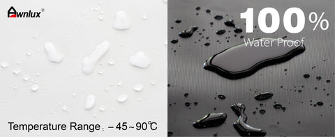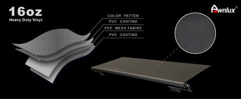 Our 100% PVC RV awning fabric is made of high-quality 16oz vinyl material, which is 100% waterproof and thermally insulated. Temperature range: -49~194 degrees. Resistant to UV light, mold/mildew, water, and more. UV-resistant fabric is rated UPF 50+ to block sun rays and help prevent color fade.