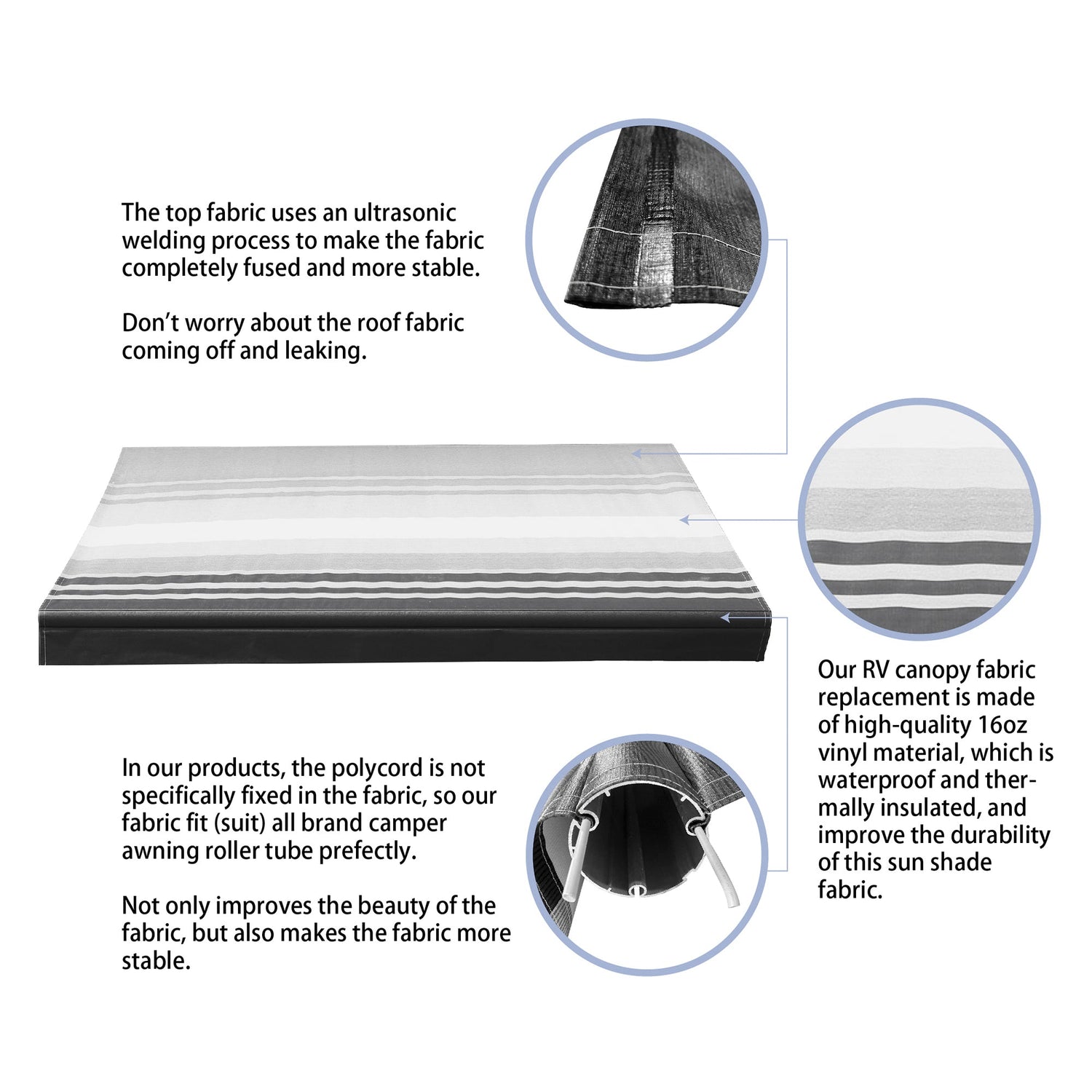 Note: When you clean the fabric only use natural soap and clean water andmake sure ALL the cleaner is rinsed off after cleaning. Never use detergent.oilbased cleaners, or any caustic, granulate, or abrasive type cleaners.Airdry, DON'Troll up the awning until the fabric is completely dry.Vinyl fabric offers the advantage of durability and water resistance.Wrinkling may be more noticeable when retracted and after prolongedperiods of storage. in warm weather, open it up for a period of time tominimize the wrinkling. Leave the awning open during warm weather tominimize the wrinkling over time.